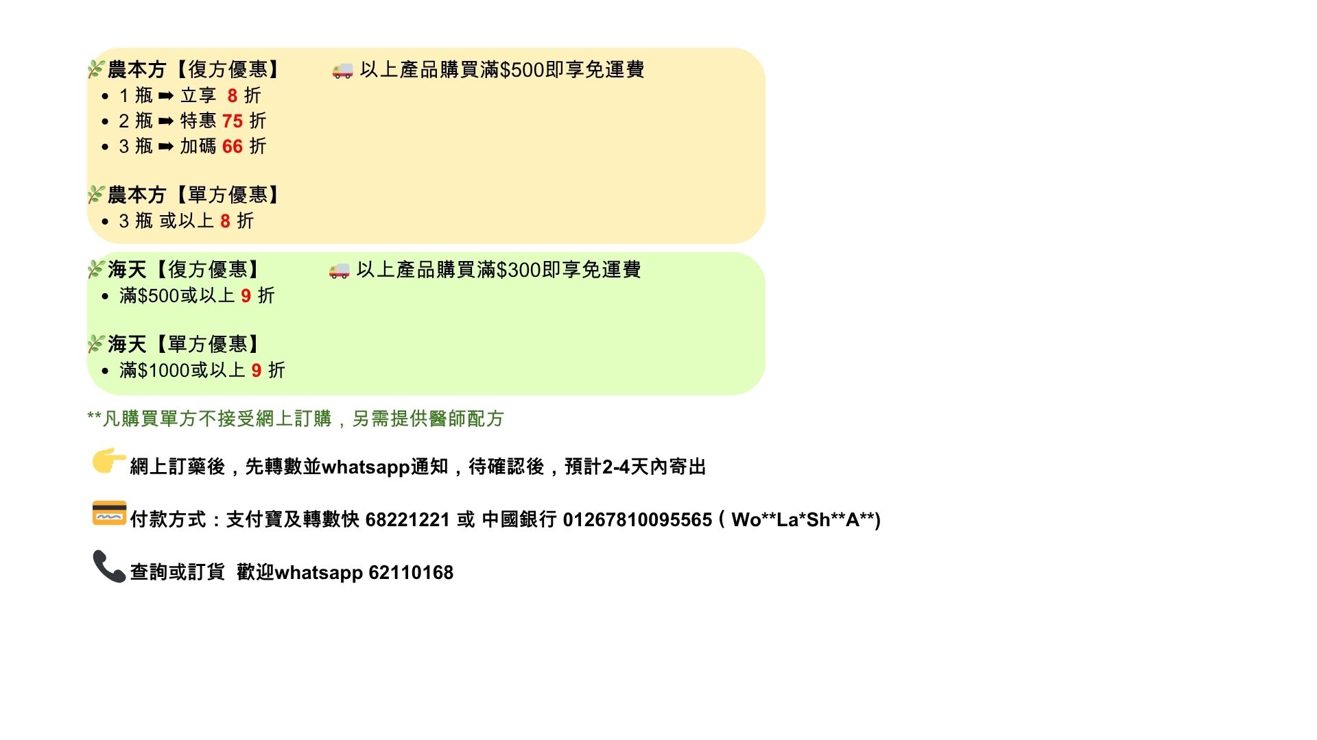 歡迎透過WhatsApp或微信WeChat 62110168 訂購藥品